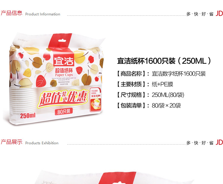 供应商:京东 品牌:宜洁(yekee) 产地:安徽桐城 重量:8.700 销售单位:箱 包装清单:yekee 一次性杯子纸杯80只/袋250ML20袋1600只 JD-7136 售后信息:不支持7天无理由退货
