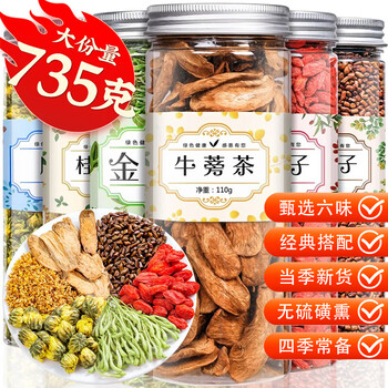 供应商:京东 品牌:福茗源 产地:中国大陆 重量:1.060 销售单位:罐 包装清单:牛蒡茶110g*1/金银花30g*1/红枸杞180g*1/决明子320g*1/桂花茶45g*1/胎菊50g*1 售后信息:不支持7天无理由退货