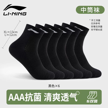• 李宁袜子男(六双装)篮球袜运动袜生活袜羽毛球跑步女夏季透气吸汗棉袜