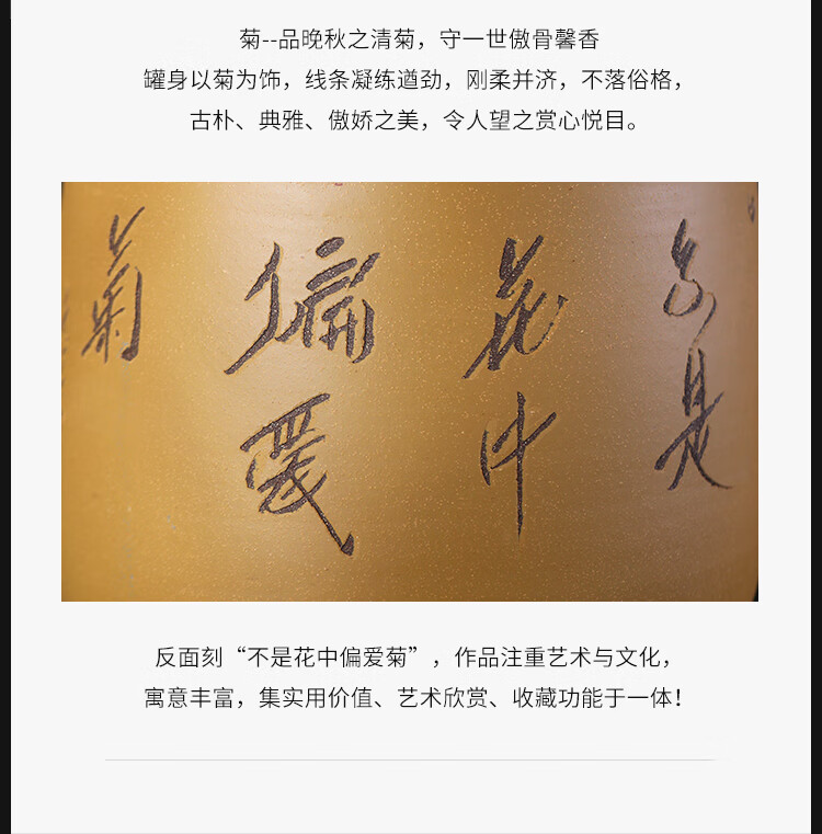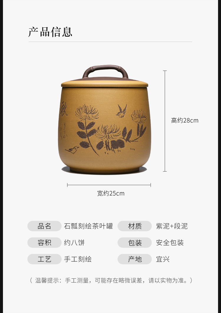 供应商:京东 品牌:金镶玉 产地:江苏宜兴 重量:4.510 销售单位:个 包装清单:茶叶罐1个 售后信息:不支持7天无理由退货