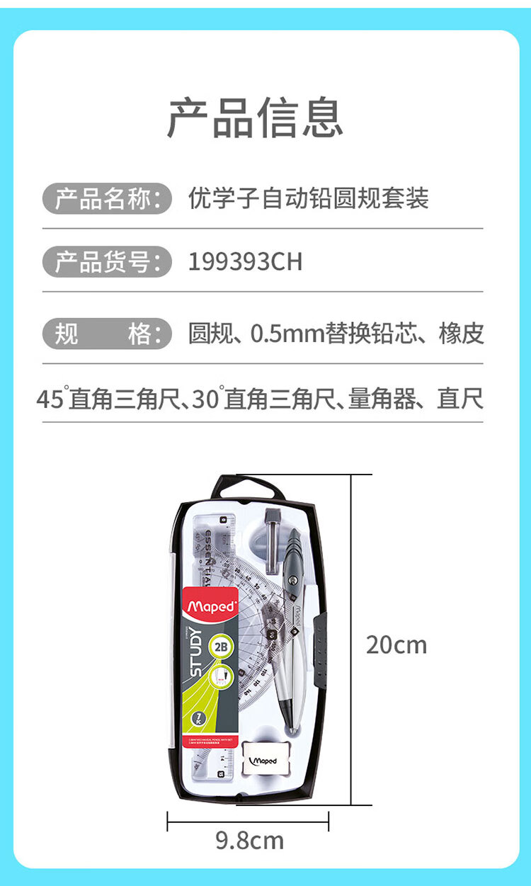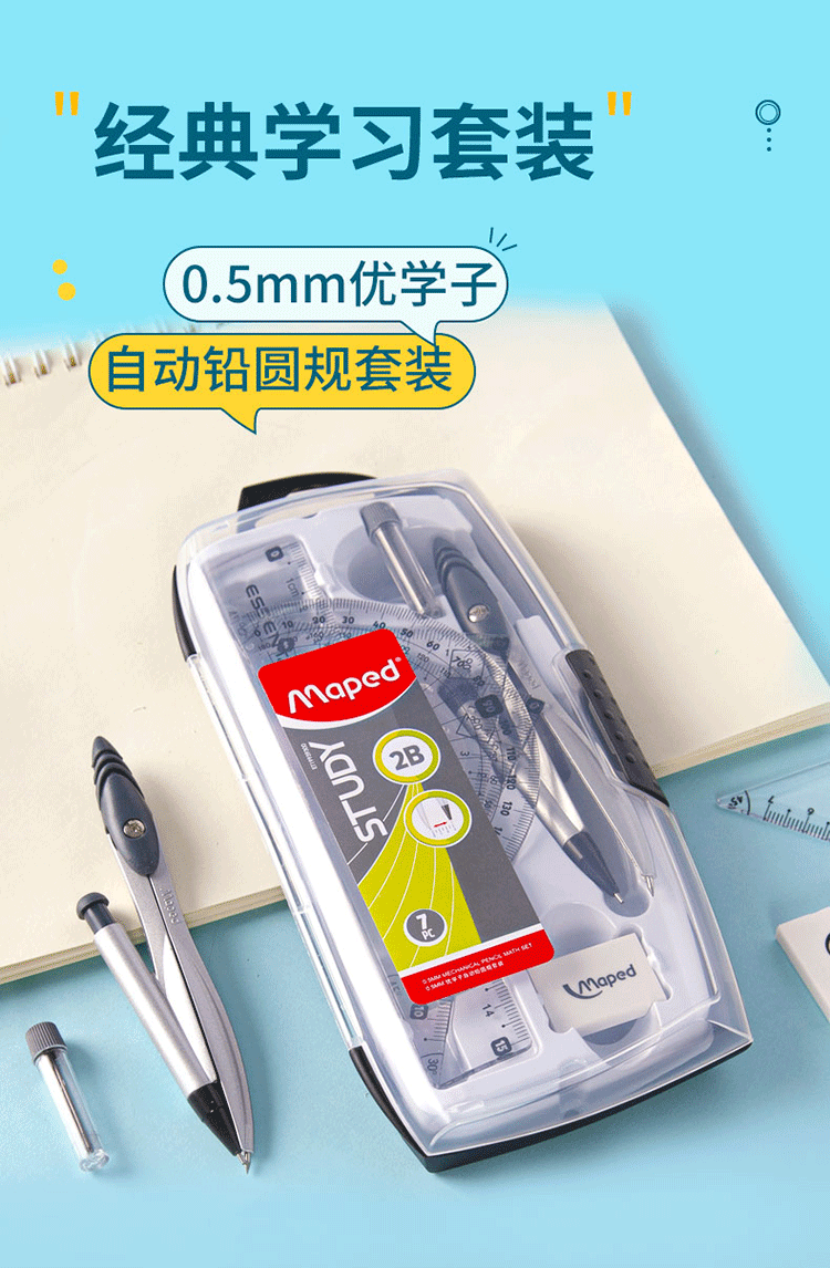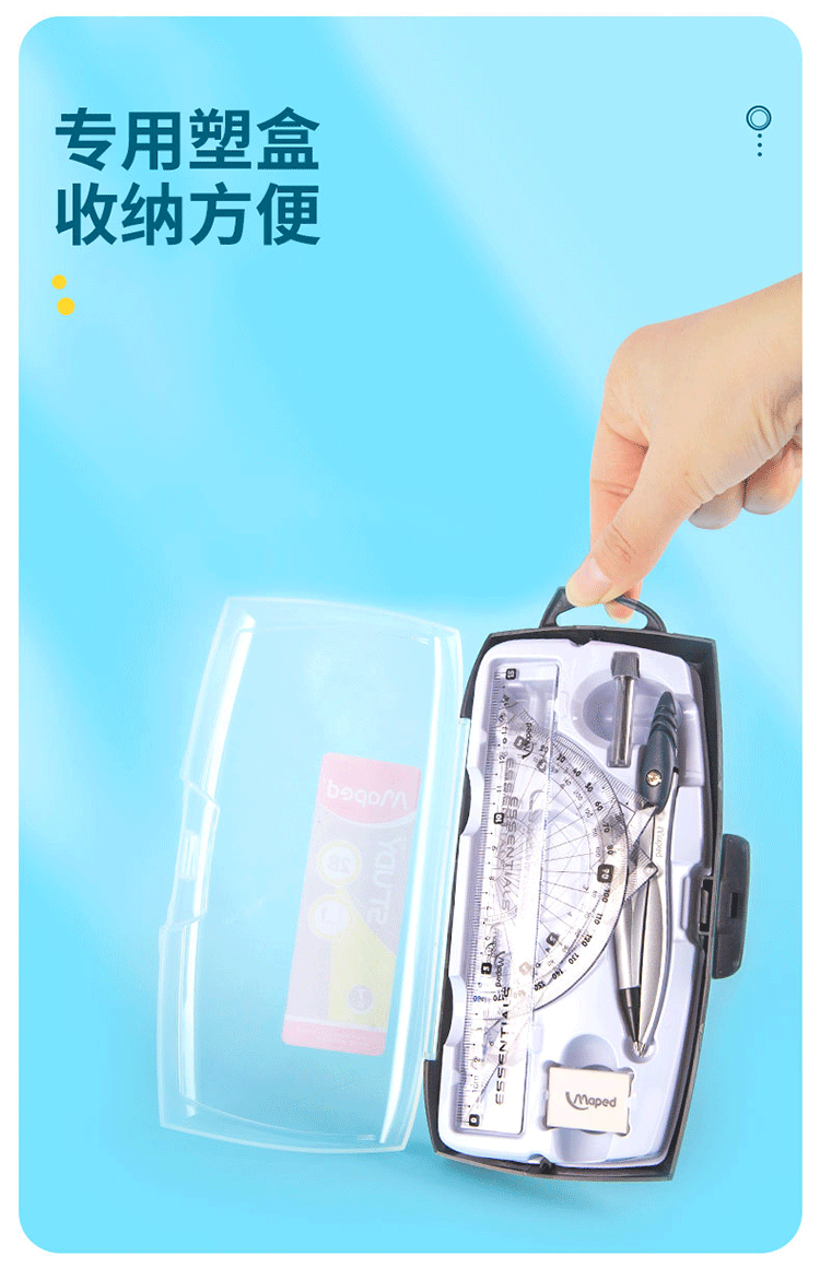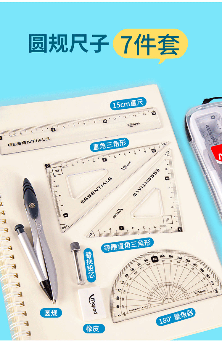 供应商:京东 品牌:马培德(Maped) 产地:中国大陆 重量:0.100 销售单位:个 包装清单:圆规*1;2B铅芯*1;15cm直尺*1;180°量角器*1;60°三角尺*1;45°三角尺*1;橡皮*1 售后信息:不支持7天无理由退货