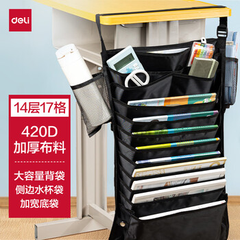 得力(deli)挂书袋课桌书挂袋 升级款交叉收纳书桌挂袋 学生书本收纳神器 加厚款十四层 黑色开学必备   收藏