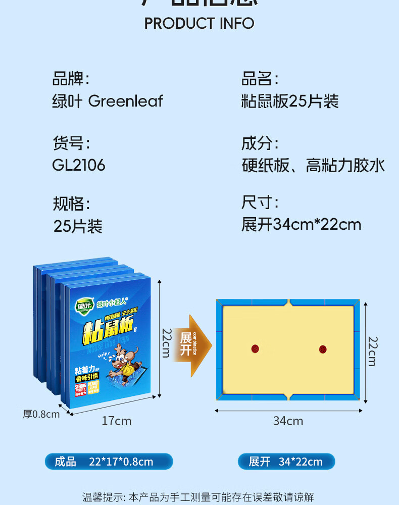 供应商:京东 品牌:绿叶(Green Leaf) 产地:江苏苏州 重量:4.120 销售单位:箱 包装清单:粘鼠板*25 售后信息:不支持7天无理由退货