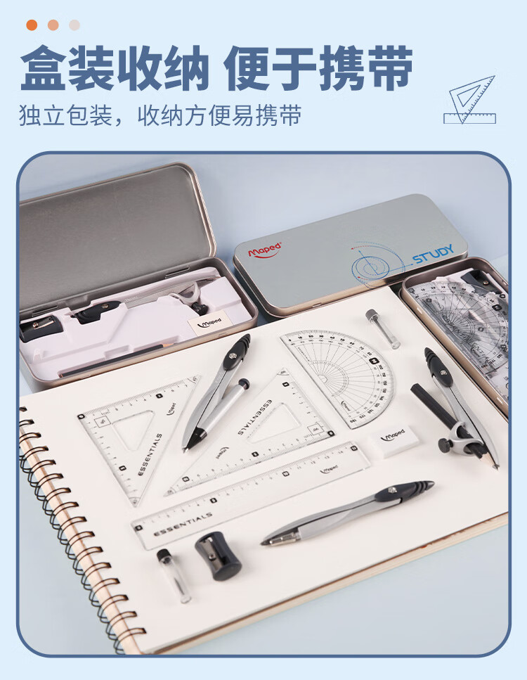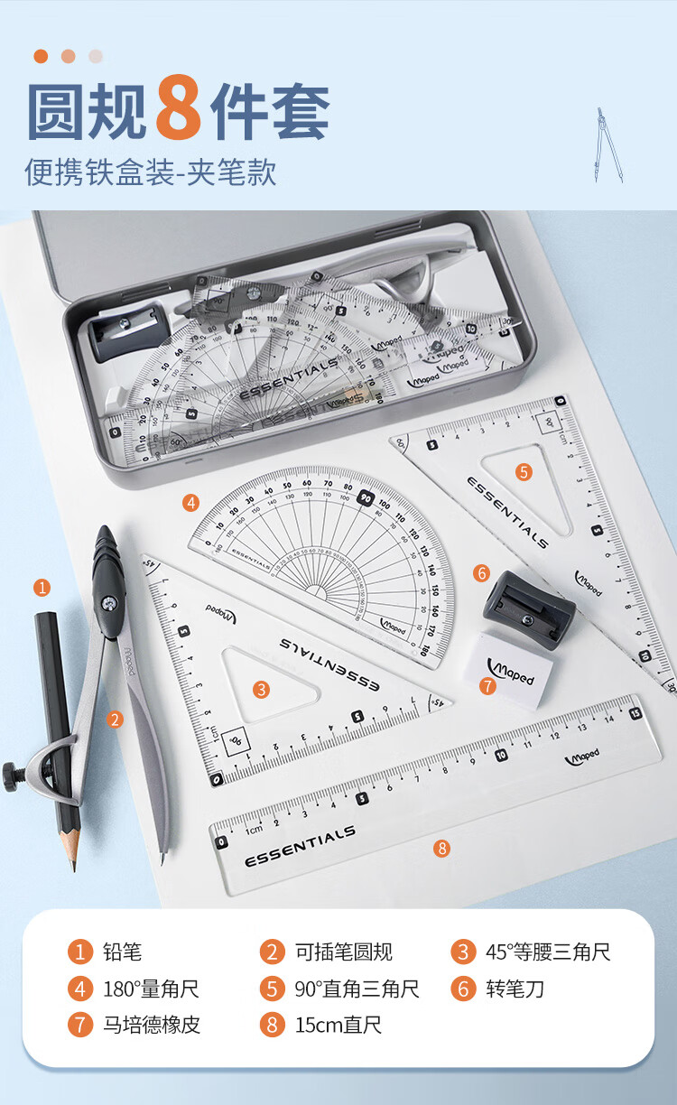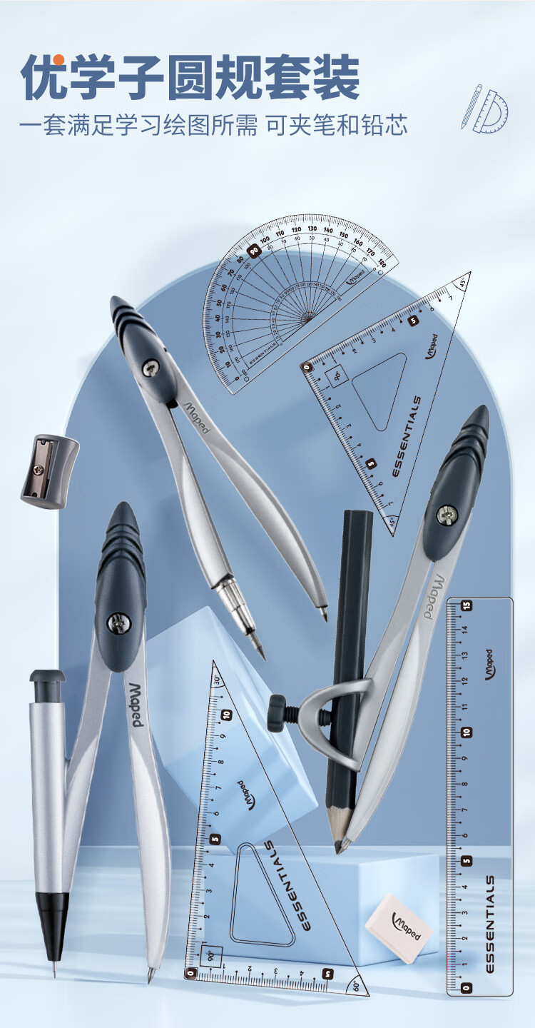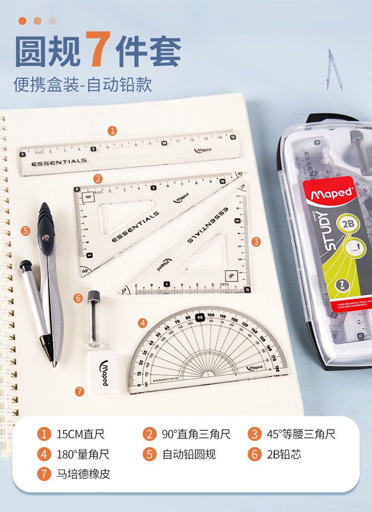 供应商:京东 品牌:马培德(Maped) 产地:中国大陆 重量:0.150 销售单位:盒 包装清单:铅芯圆规*1;可插笔圆规*1;15cm直尺*1;180°量角器*1;60°三角尺*1;15°三角尺*1;铅笔*1;橡皮*1;卷笔刀*1;HB铅芯*1 售后信息:不支持7天无理由退货