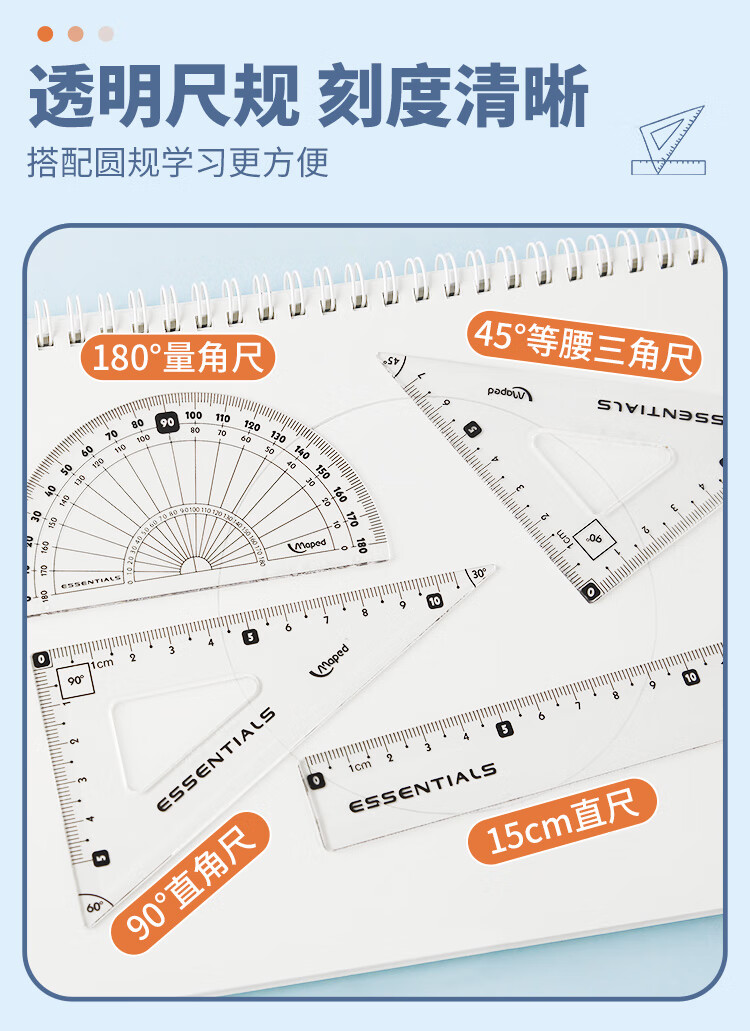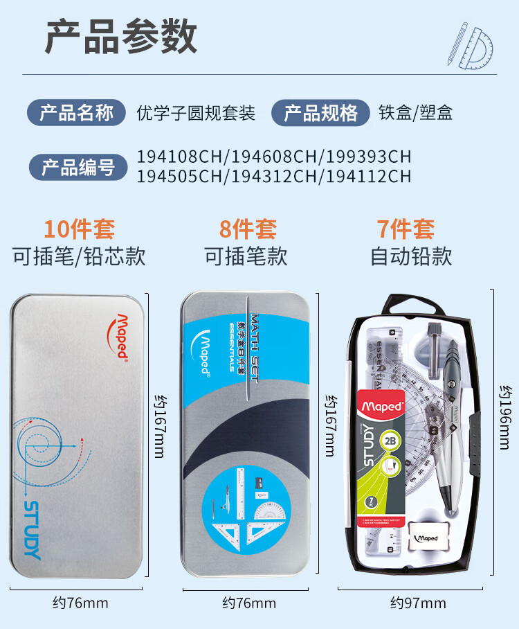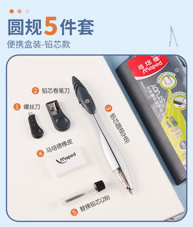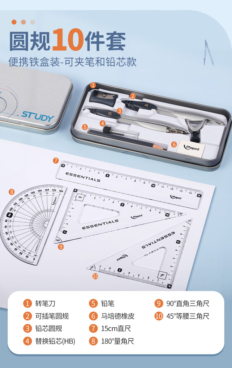 供应商:京东 品牌:马培德(Maped) 产地:中国大陆 重量:0.150 销售单位:盒 包装清单:铅芯圆规*1;可插笔圆规*1;15cm直尺*1;180°量角器*1;60°三角尺*1;15°三角尺*1;铅笔*1;橡皮*1;卷笔刀*1;HB铅芯*1 售后信息:不支持7天无理由退货