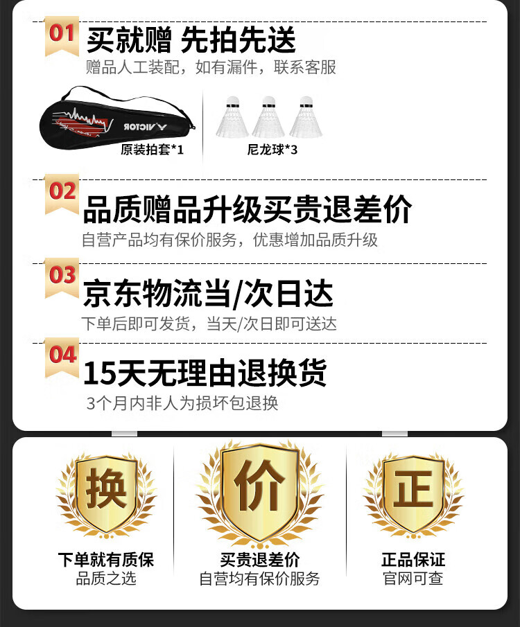 供应商:京东 品牌:威克多(VICTOR) 产地:南京监制 重量:0.400 销售单位:支 包装清单:羽毛球拍1对,套装1个 售后信息:不支持7天无理由退货
