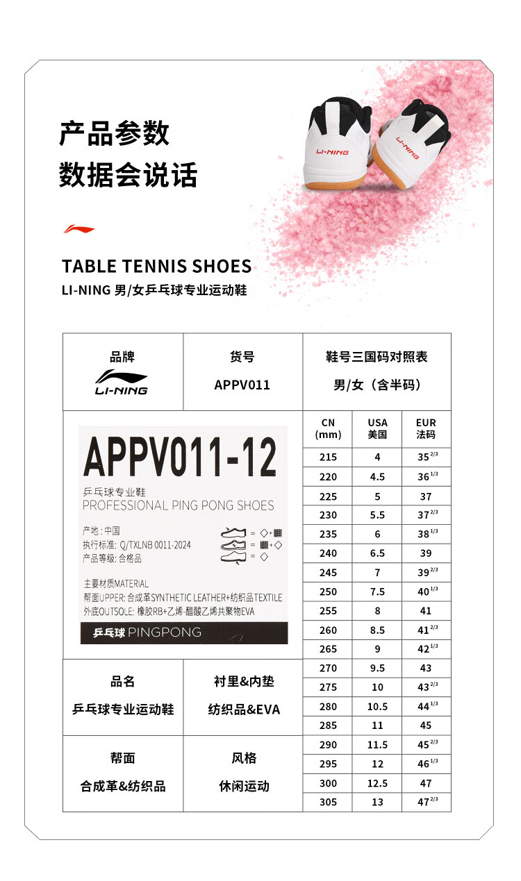 供应商:京东 品牌:李宁(LI-NING) 产地:中国广东 重量:0.650 销售单位:双 包装清单:乒乓球鞋*1双 售后信息:不支持7天无理由退货
