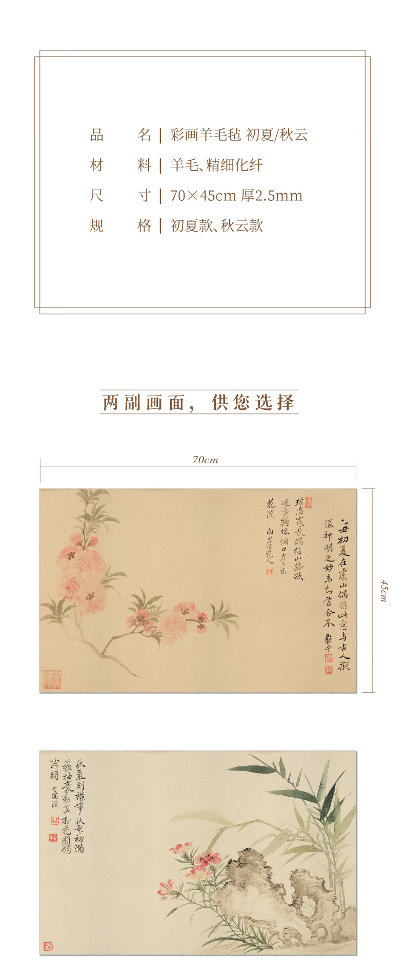 供应商:京东 品牌:漢墨(HANMO) 产地:中国大陆 重量:0.100 销售单位:张 包装清单:彩画羊毛毡 双面 初夏*1 售后信息:不支持7天无理由退货