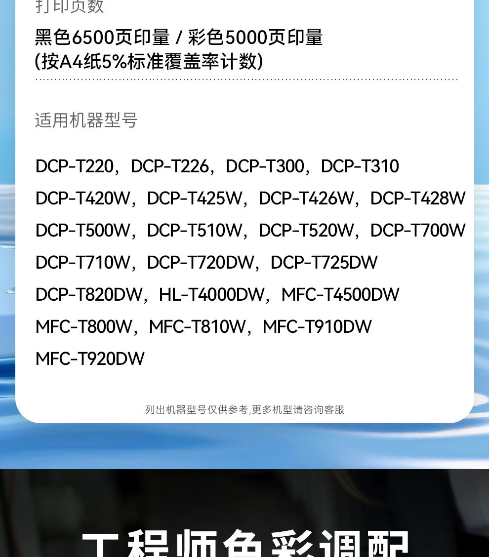 | 适用机型 | DCP-T226;DCP-T426W;DCP-C421W;DCP-T720DW;DCP-T725DW;DCP-T520W;DCP-T820DW;DCP-T500W;HL-T4000DW |