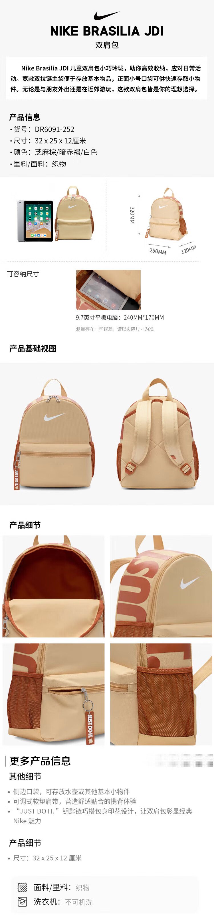 • 耐克儿童双肩包 玲珑小巧旅行包书包休闲包DR6091-252 棕