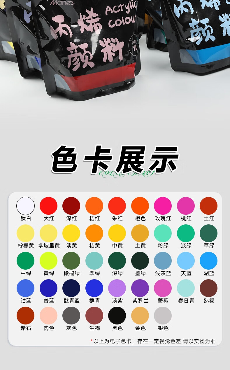 供应商:京东 品牌:马利(Marie's) 产地:中国大陆 重量:0.940 销售单位:袋 包装清单:丙烯颜料袋装*1 售后信息:不支持7天无理由退货