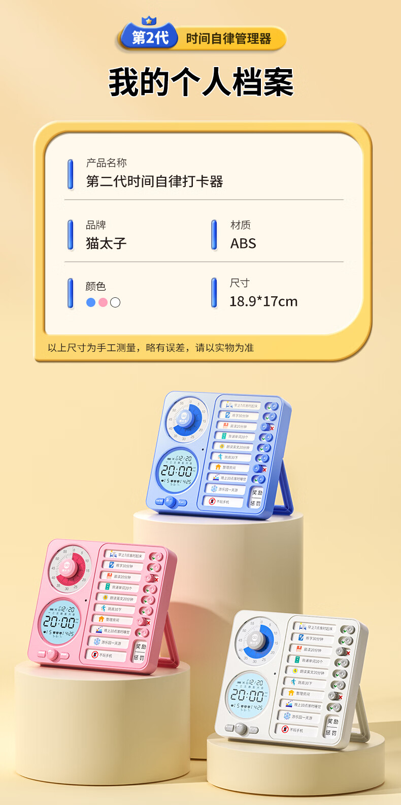 供应商:京东 品牌:猫太子 产地:中国大陆 重量:0.610 销售单位:件 包装清单:可视化时间管理器(充电款)*1 售后信息:不支持7天无理由退货