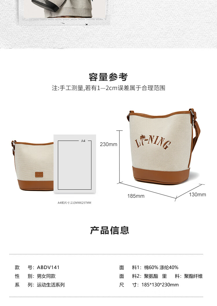 供应商:京东 品牌:李宁(LI-NING) 产地:中国大陆 重量:0.500 销售单位:个 包装清单:包:1件;吊牌:1组;包装袋:1个; 售后信息:不支持7天无理由退货