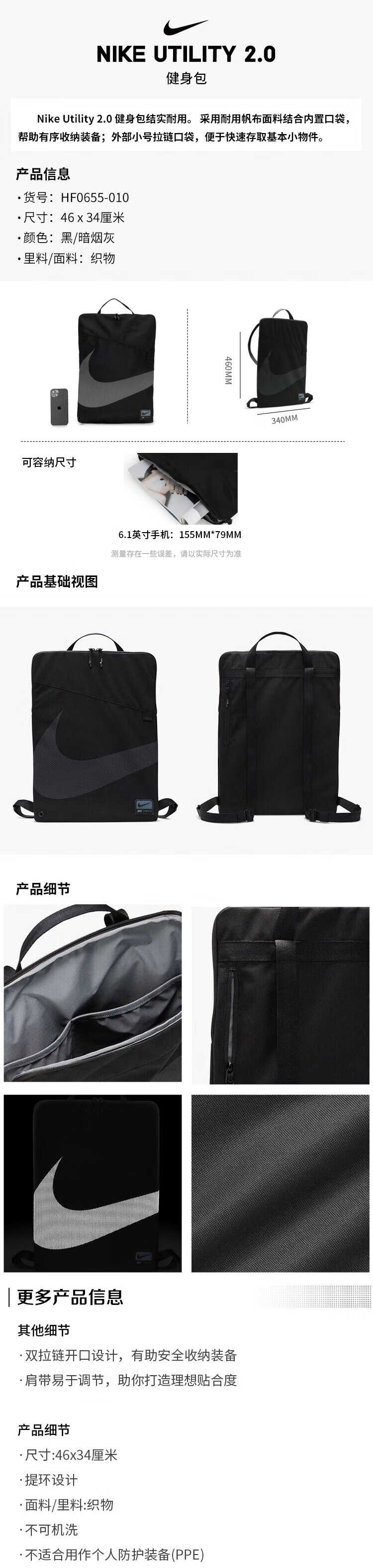 耐克(NIKE)男女双肩包电脑包 健身包旅行包背包休闲包HF0655-010 黑书包   收藏