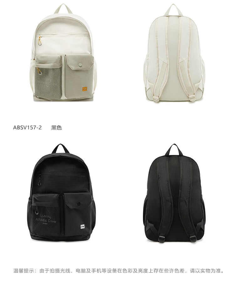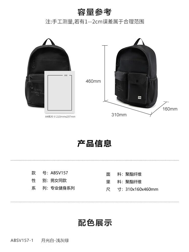 • 李宁健身系列丨防泼水运动双肩包男女同款大容量轻便旅行背包ABSV157