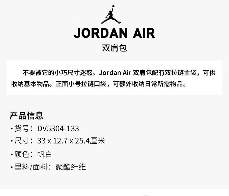 Jordan男女乔丹 聚酯纤维 书包背包 字母印花 双肩包DV5304-133白 均码   收藏