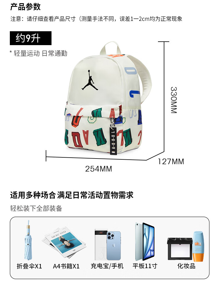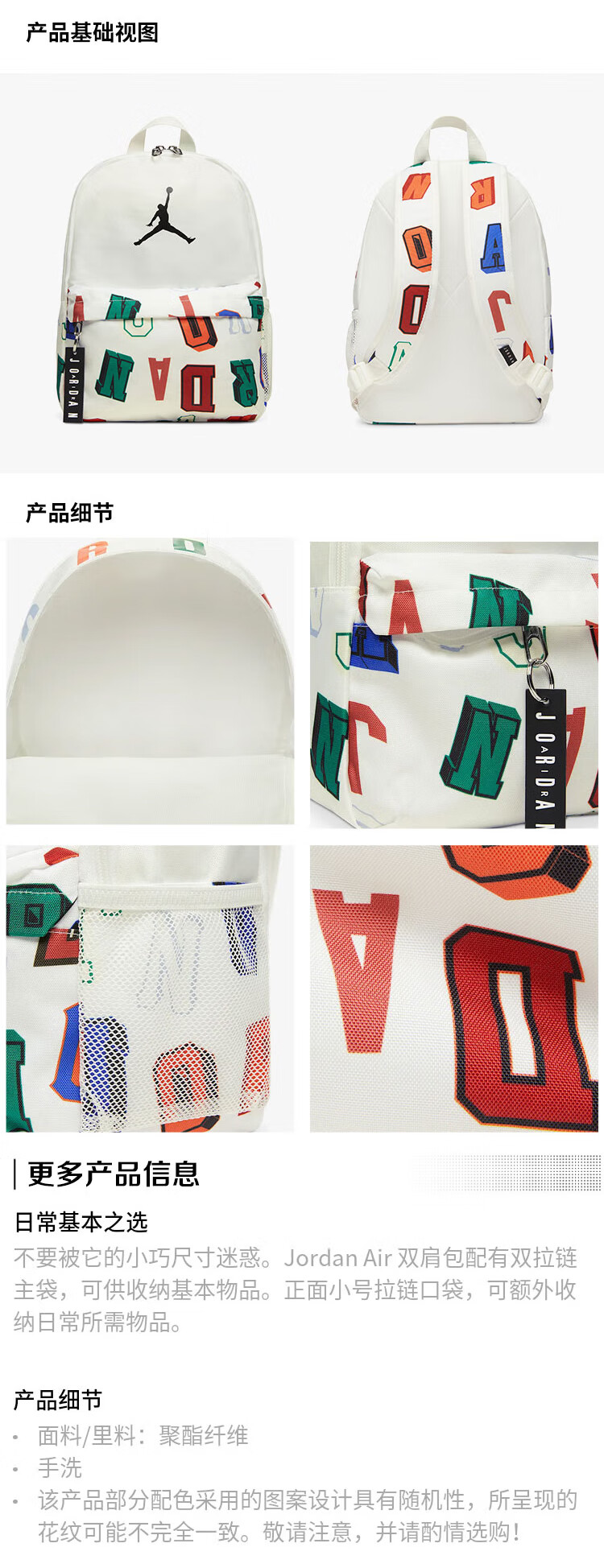 • Jordan男女乔丹 聚酯纤维 书包背包 字母印花 双肩包DV5304-133白 均码