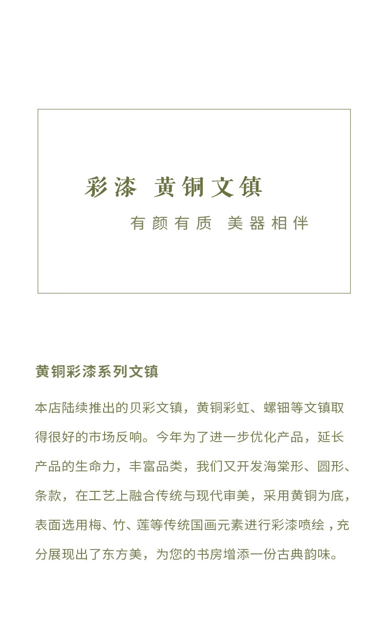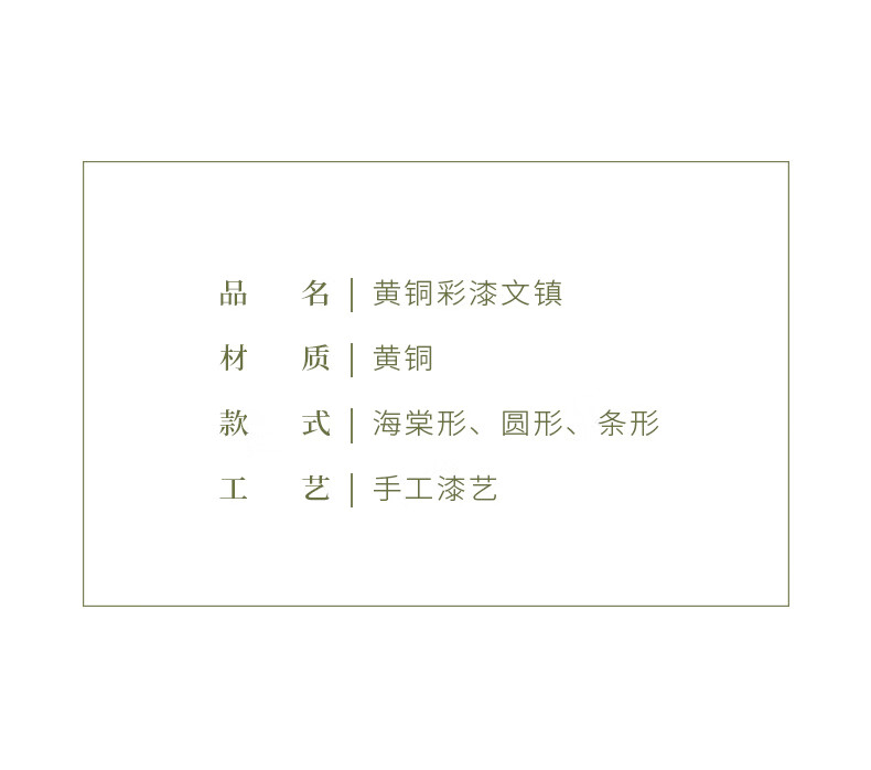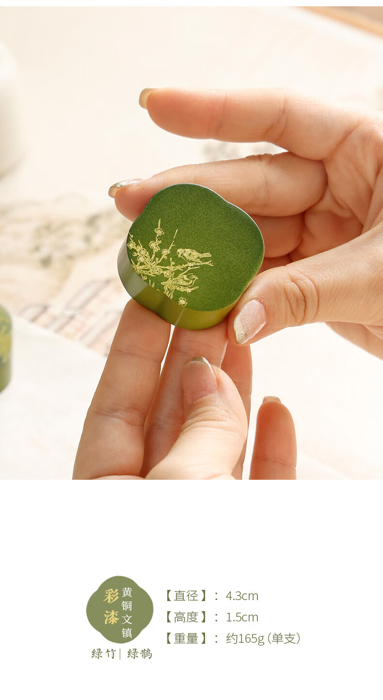 供应商:京东 品牌:漢墨(HANMO) 产地:中国大陆 重量:0.600 包装清单:黄铜 彩漆文镇 绿 花鸟 双支礼盒*1 售后信息:不支持7天无理由退货