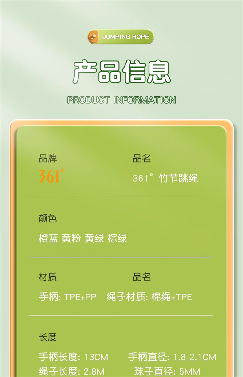 供应商:京东 品牌:361° 产地:中国大陆 重量:0.120 销售单位:条 包装清单:外包装,跳绳 售后信息:不支持7天无理由退货