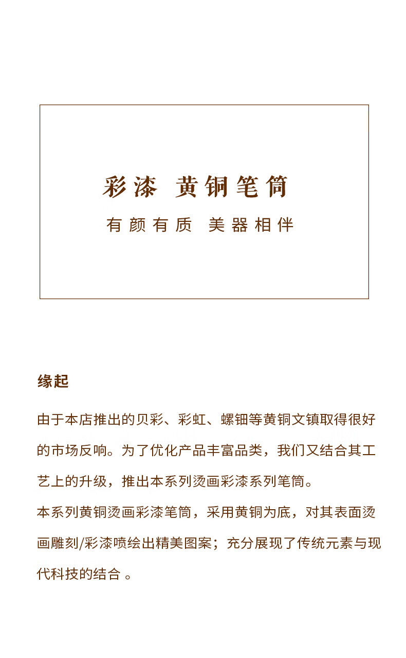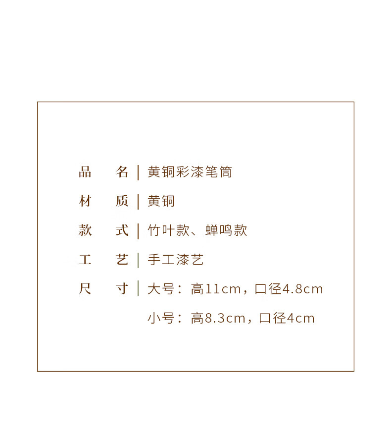 供应商:京东 品牌:漢墨(HANMO) 产地:中国大陆 重量:0.275 销售单位:个 包装清单:黄铜 彩漆笔筒 蝉鸣 大*1 售后信息:不支持7天无理由退货