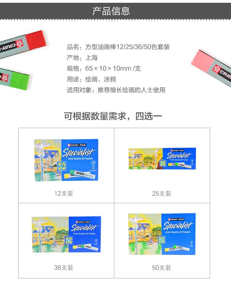 供应商:京东 品牌:樱花(SAKURA) 产地:中国大陆 重量:0.480 销售单位:盒 包装清单:36色油画棒套装*1 售后信息:不支持7天无理由退货