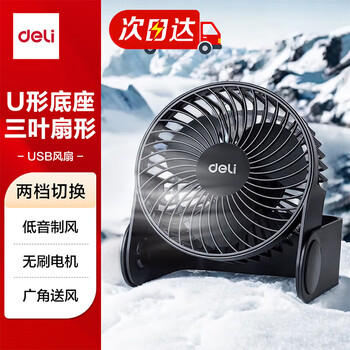 • 得力USB桌面风扇两档风速迷你轻音家用卧室办公室台式桌面风扇学生宿舍风扇U型底座小台扇/电风扇 黑