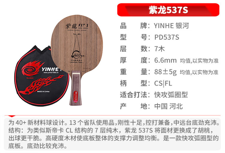 银河 乒乓球底板乒乓球拍横板横拍FL单拍 紫龙537S 附拍套   收藏