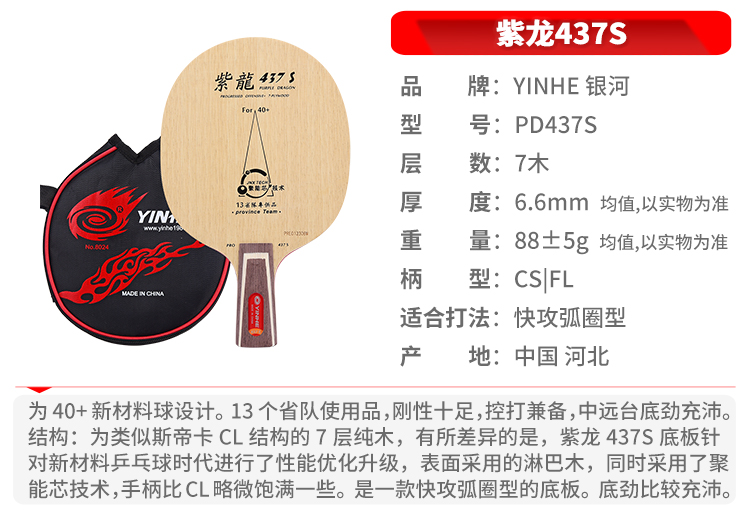 • 银河 乒乓球底板乒乓球拍直拍 紫龙PD-437S纯木7层 附拍套