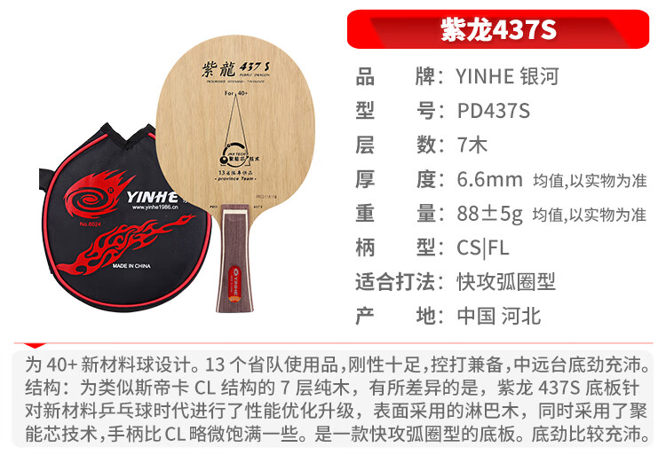 银河 乒乓球底板乒乓球拍横板横拍FL单拍 紫龙437S 附拍套   收藏