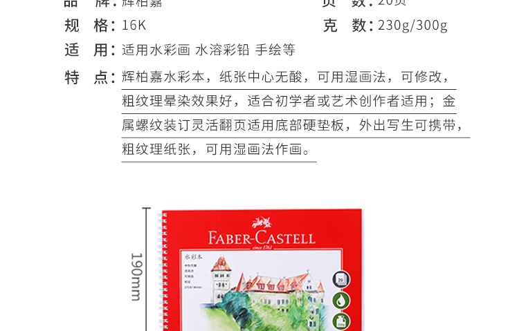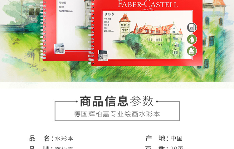 供应商:京东 品牌:辉柏嘉(Faber-castell) 产地:中国 重量:0.300 销售单位:个 包装清单:水彩本 x1 售后信息:不支持7天无理由退货