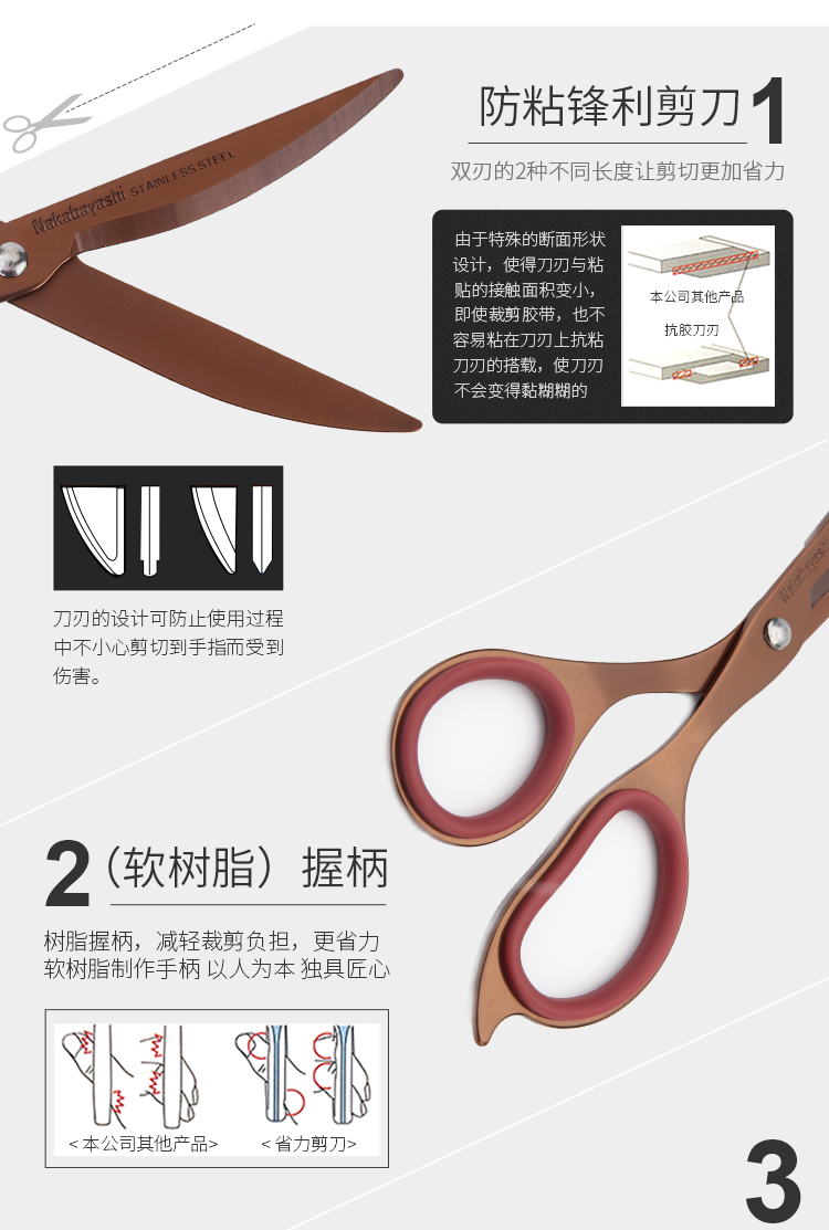 • 仲林(Nakabayashi)省力剪刀办公家用防粘美工刀DIY工具镀钛涂氟 香槟红 NH-HST180PB