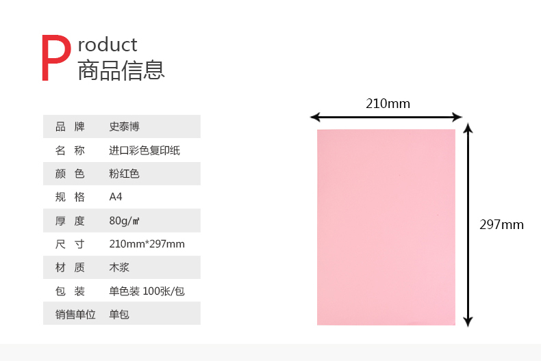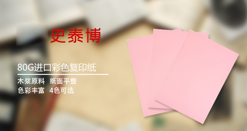 • 史泰博 80G 彩色复印纸(进口原纸) A4 粉红色 100张/包按(包)销售