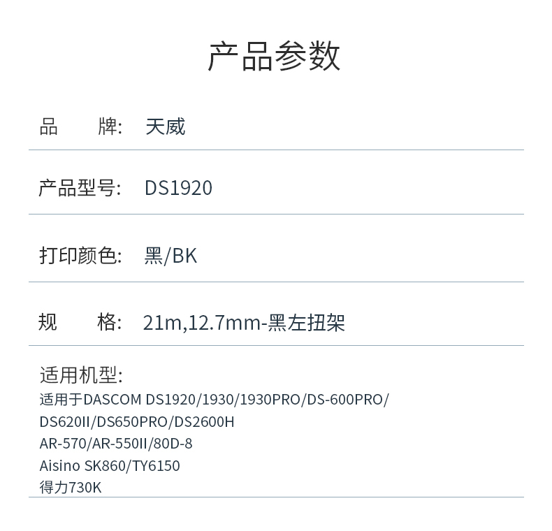 | 适用机型 | DASCOM DS1920/1930/1930PRO/DS-600PRO/DS620II/DS650PRO/ AR-570/AR-550II/80D-8 Aisino SK860/TY6150得力730K |