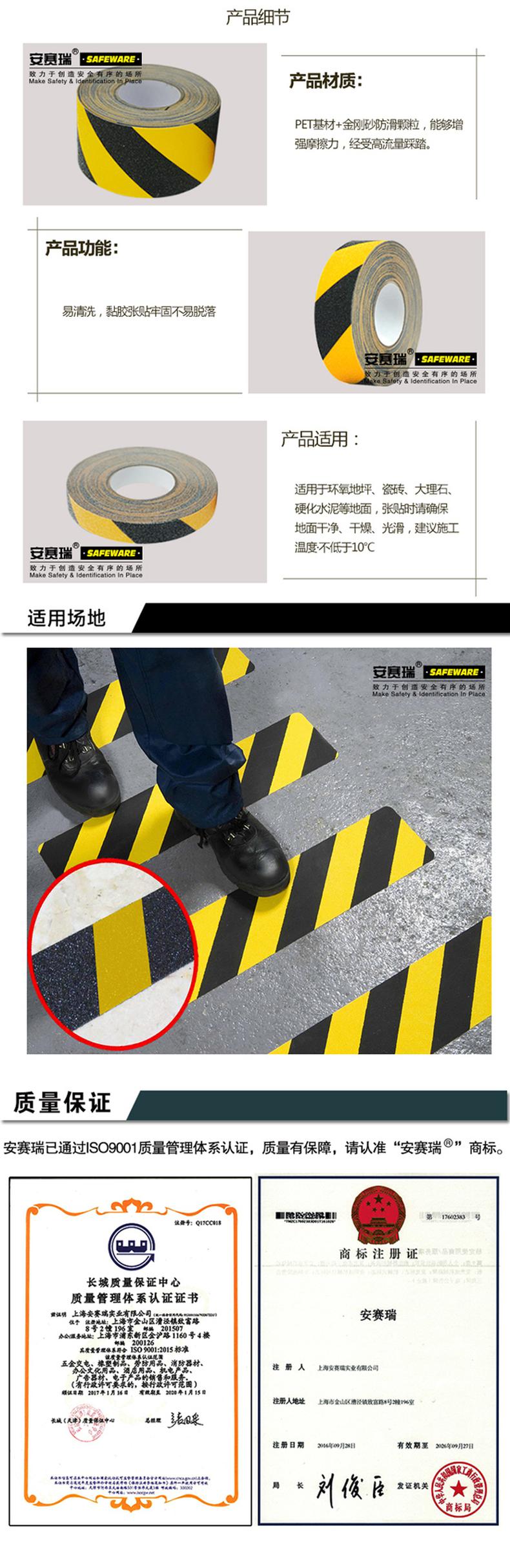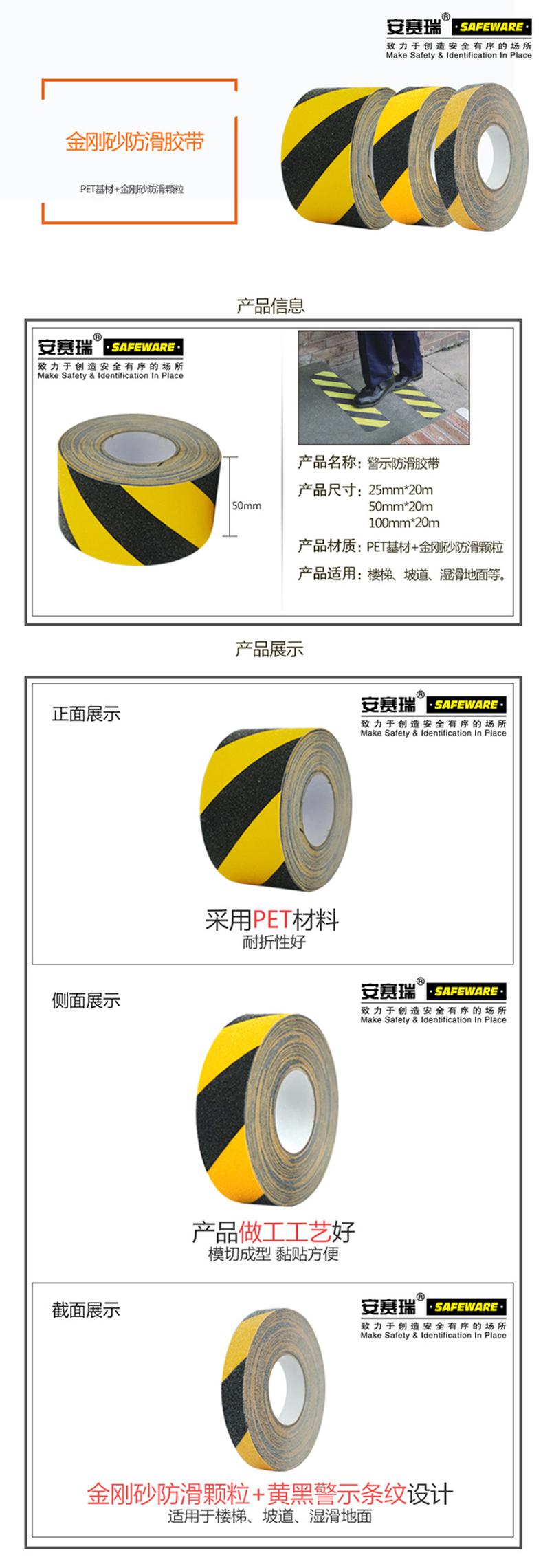 • 安赛瑞 14212 防滑胶带(黄/黑)   PET基材+金刚砂防滑颗粒,黄黑条纹,50mm×18m按(卷)销售