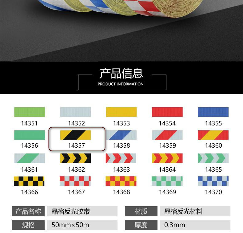 供应商:史泰博 品牌:安赛瑞 产地:中国 重量:1.000KG 销售单位:卷 包装清单:安赛瑞 14357 超级晶格反光警示胶带 黑黄色 50mm×50m*1