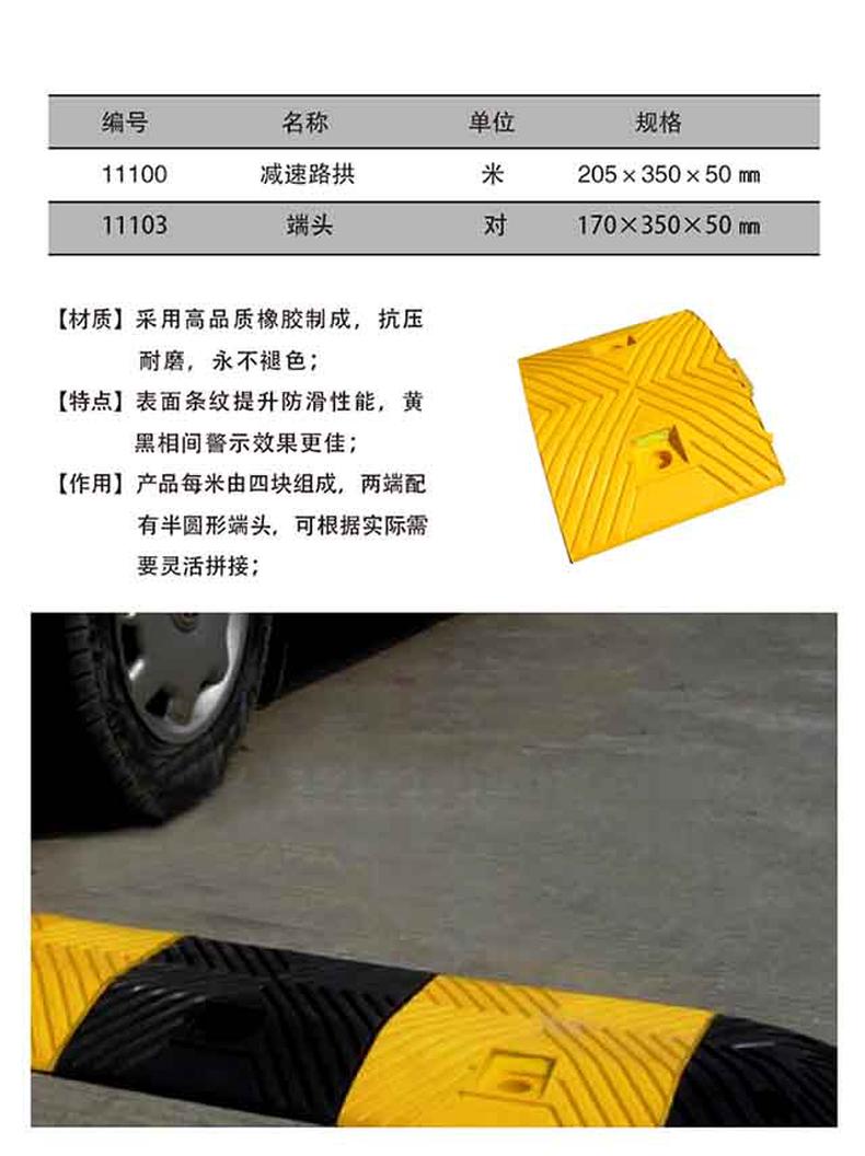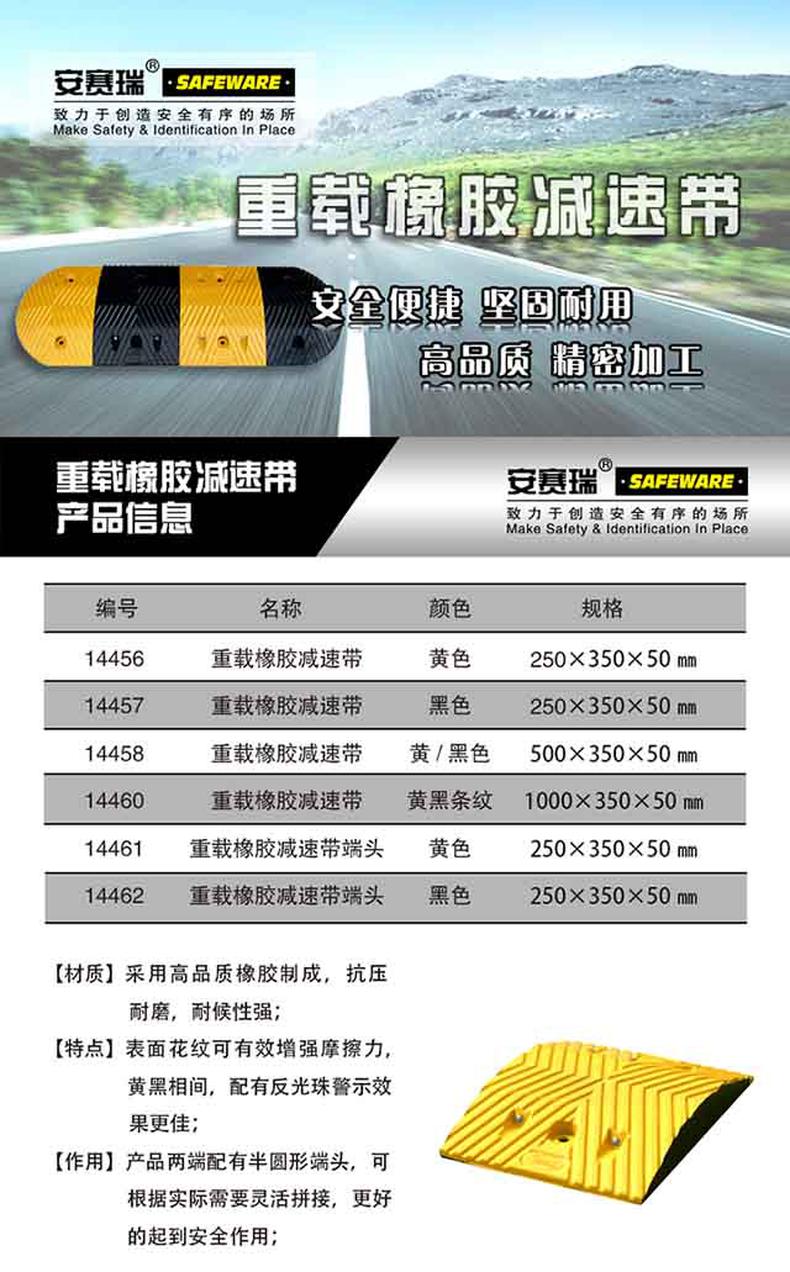 供应商:史泰博 品牌:安赛瑞 产地:中国 重量:5.000KG 销售单位:块 包装清单:安赛瑞 14456 重载橡胶减速带 黄色 250×350×50mm*1