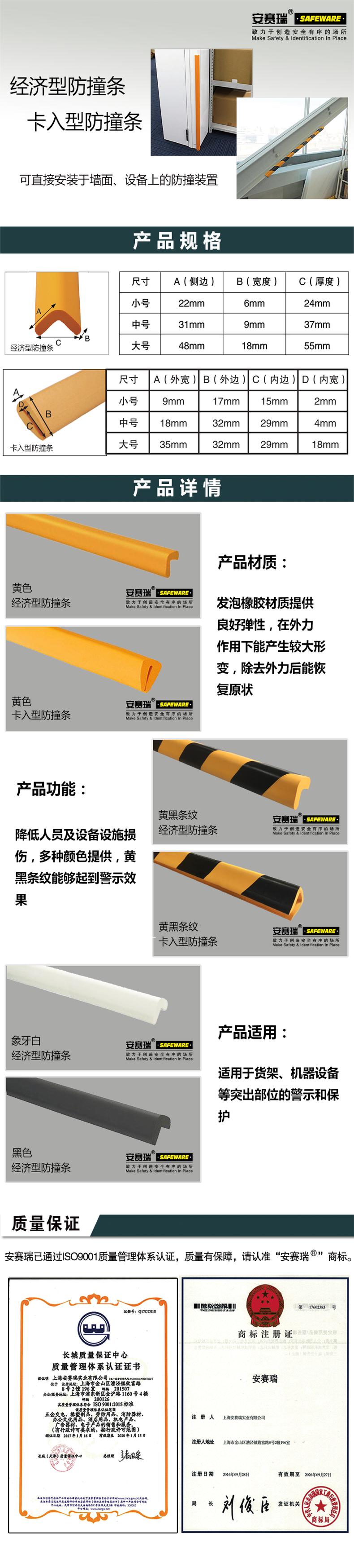 供应商:史泰博 品牌:安赛瑞 产地:中国 重量:0.200KG 销售单位:根 包装清单:安赛瑞 11625 经济型防撞条 黑色 31×31×905mm*1