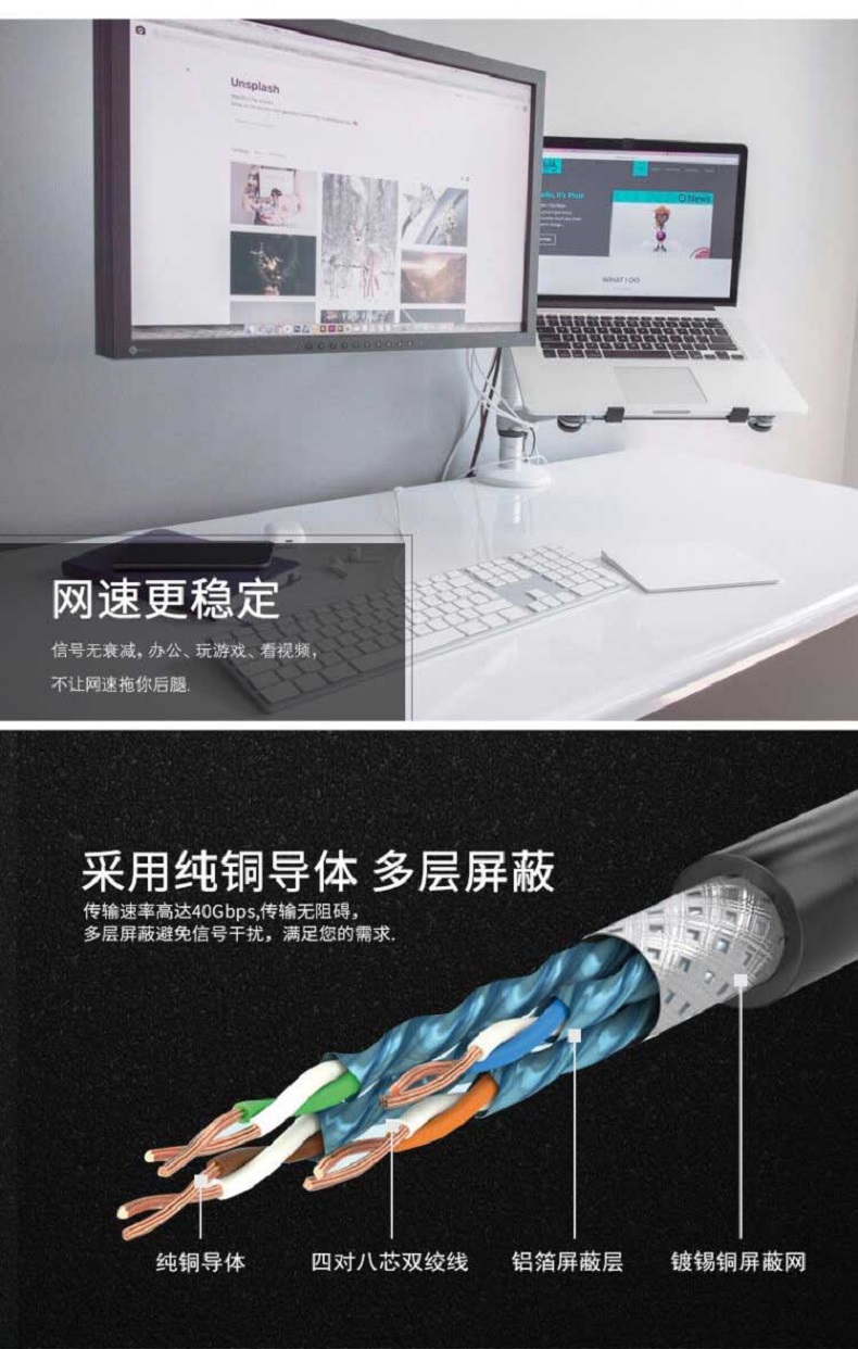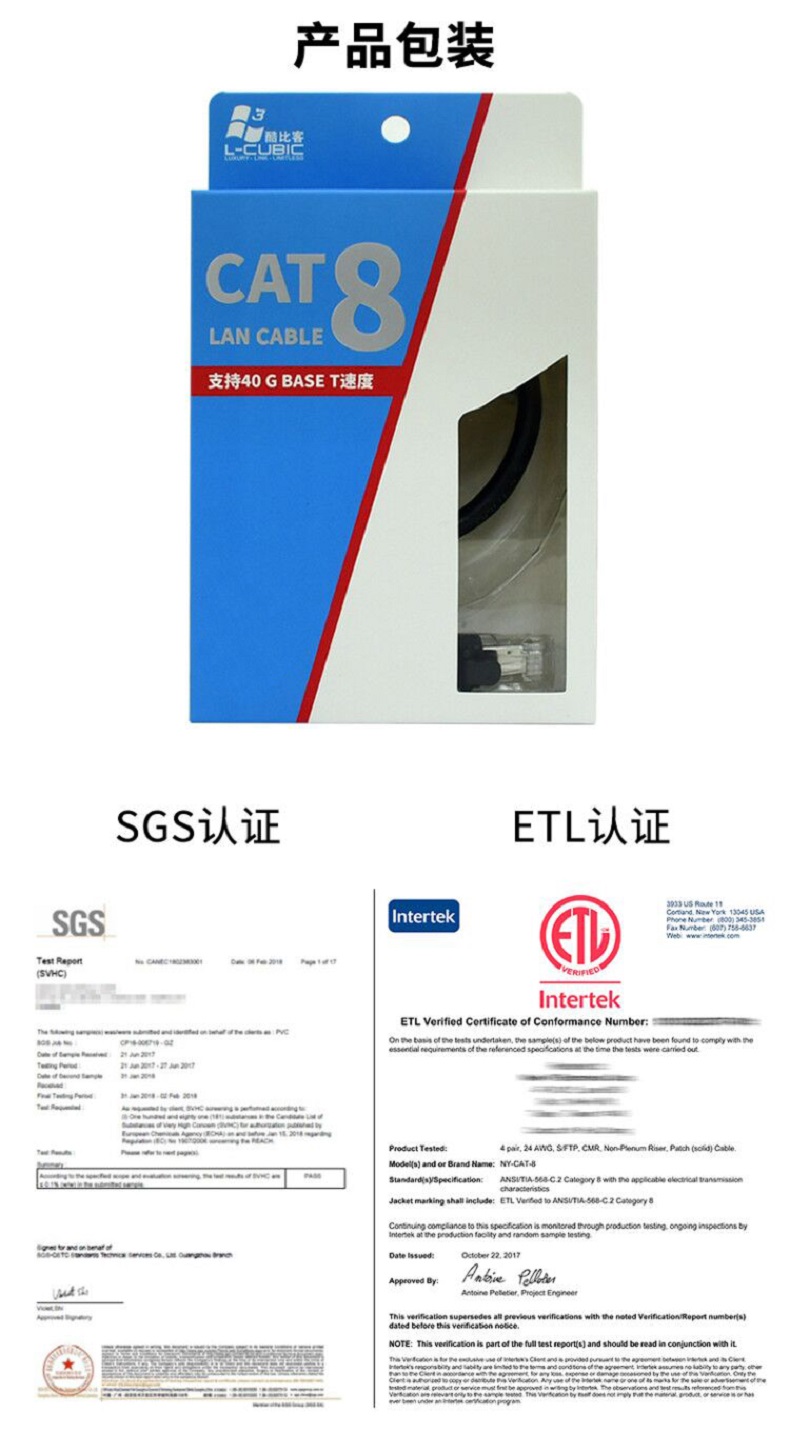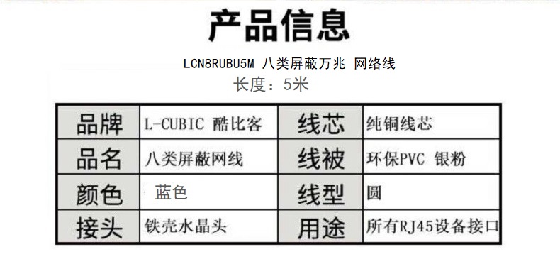 | 其他特性 | 1. 纯铜导体, 具有传输信号衰减小、损耗小、传输速度高等特点 2. 双层屏蔽线材,能有效阻挡外界干扰信号,传输性能更高、更稳定 3.水晶头采用金属镀金插头,提供卓越的导通性,更有防锈蚀特性 4.使用保护弹片设计,产品使用更加方便、耐用 5.线材与水晶头采用机器一体式成型结合,产品更加结实、耐用 |
