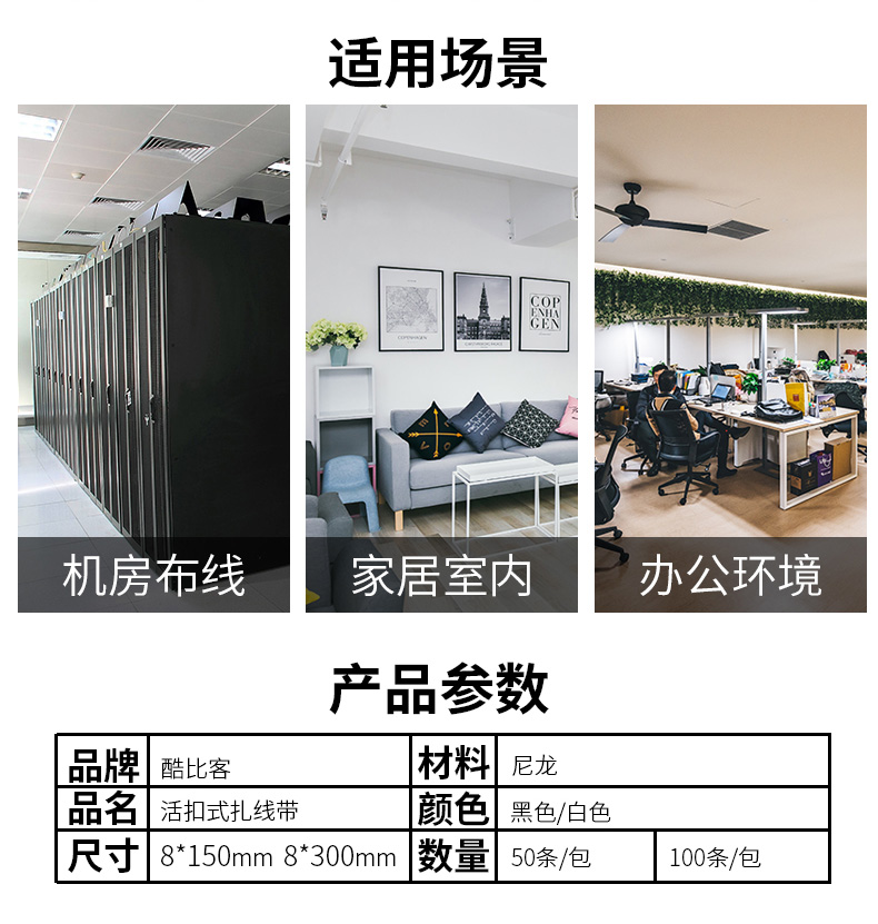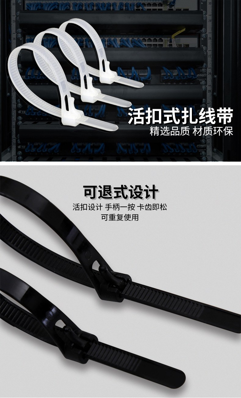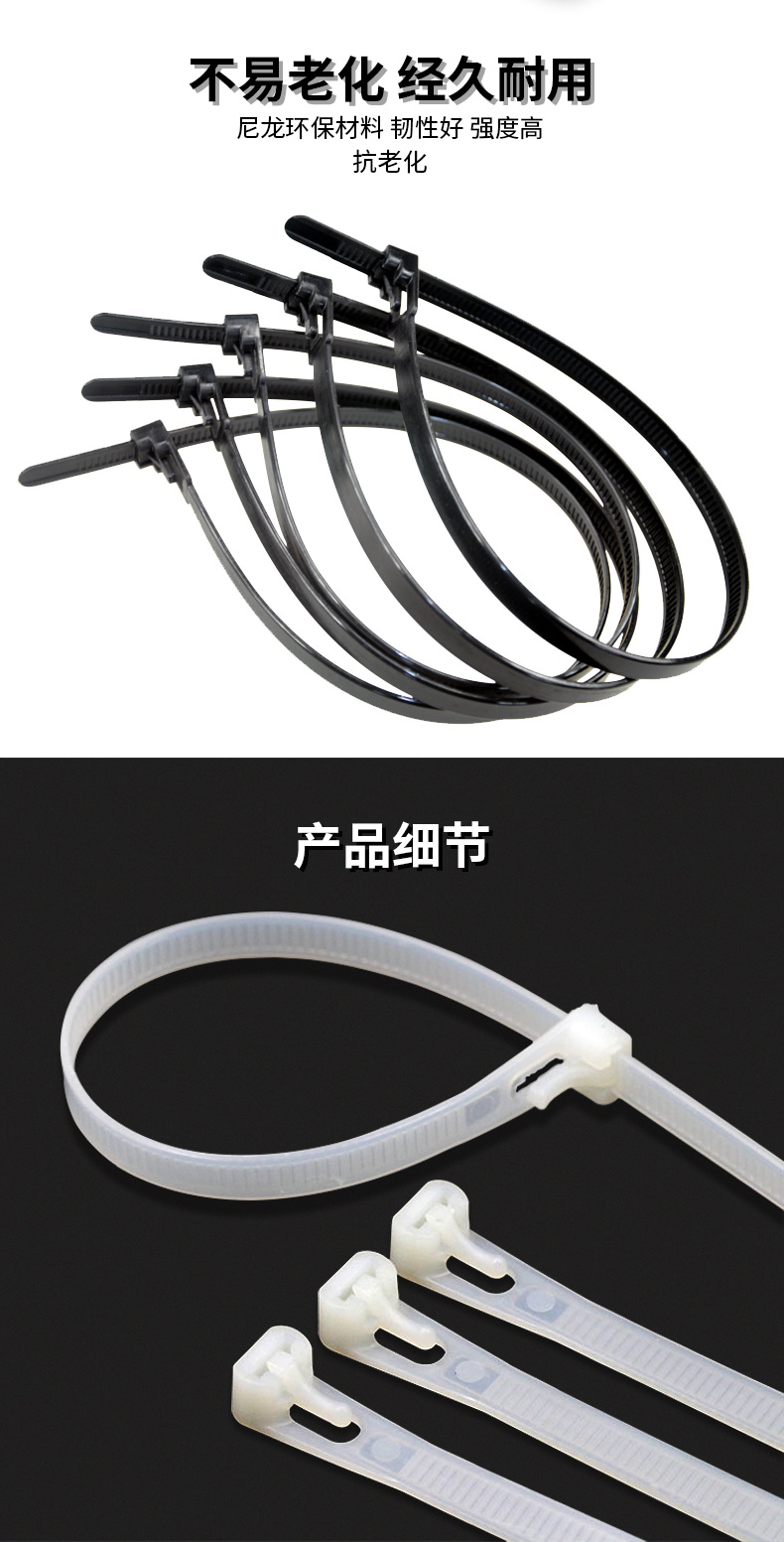 | 其他特性 | 1.尼龙材质,耐高温和腐蚀,不易老化,承受力强 2.棱纹与颗粒防滑设计,防止滑动 3.活扣式设计,可重复使用 |