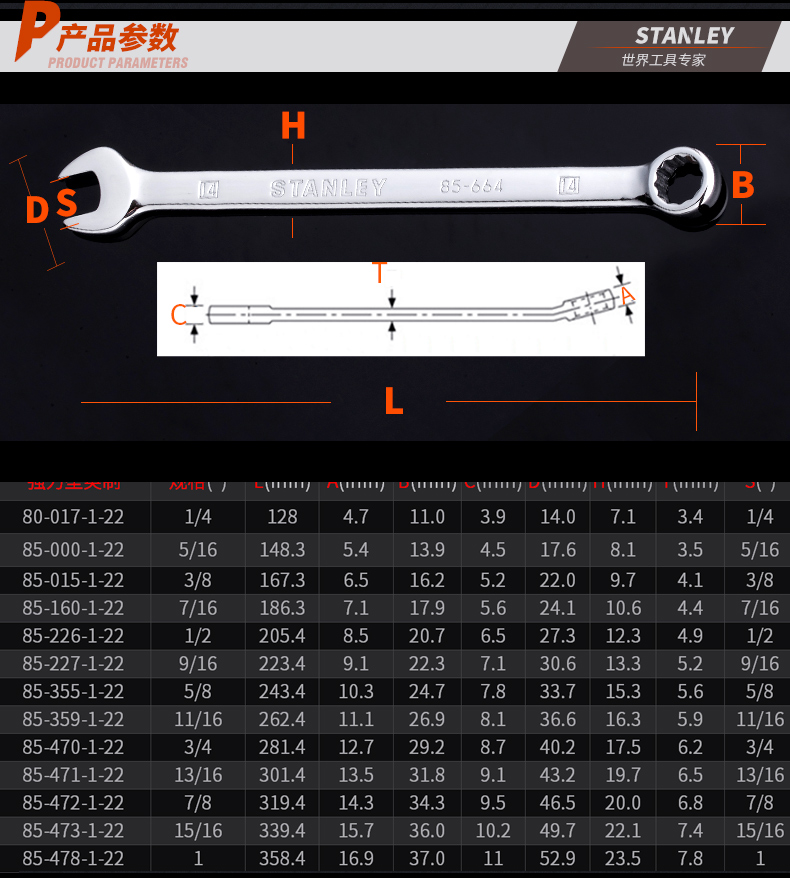 史丹利 80-017-1-22 强力型英制精抛光两用长扳手 1/4"按(把)销售   收藏