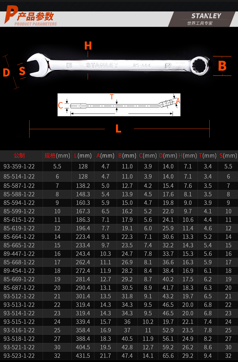 • 史丹利 85-594-1-22 强力型公制精抛光两用长扳手 9mm按(把)销售