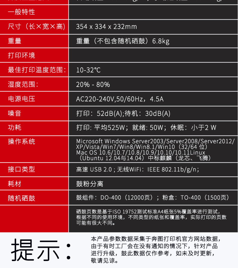| 耗材 | 鼓组件:DL-411 粉盒:TO-400 |