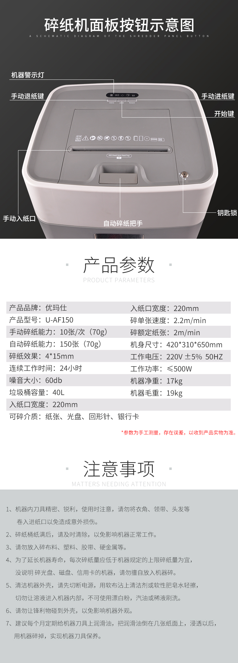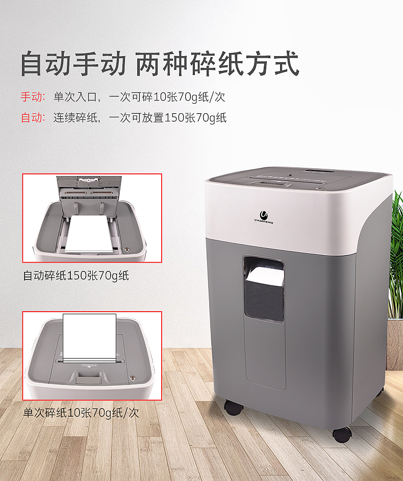 | 碎纸张数 | 手动6-8张/次 自动 150张/次(A4/70g纸) |