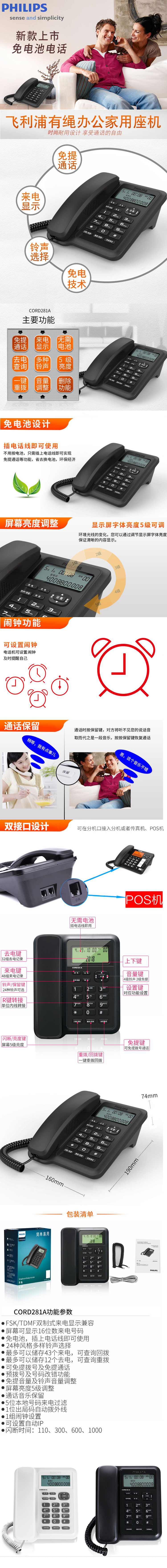 • 飞利浦 CORD 281A 电话机 办公家用 白色按(只)销售