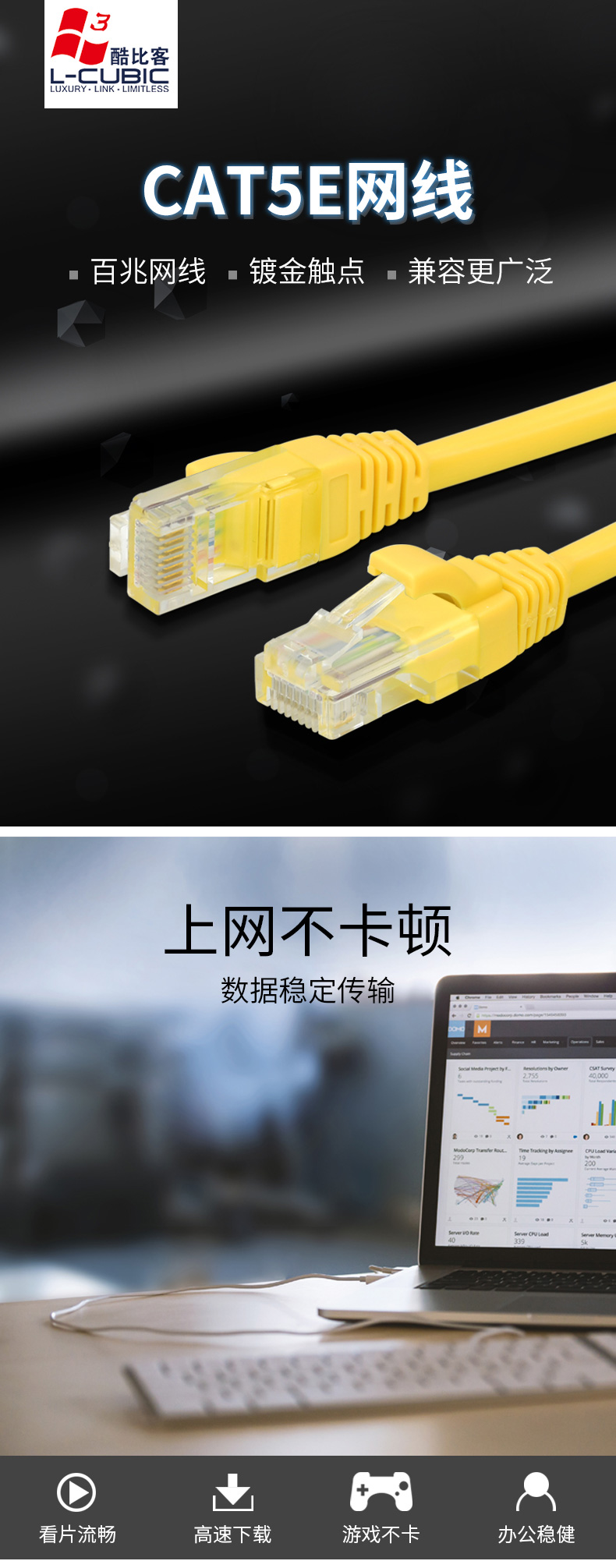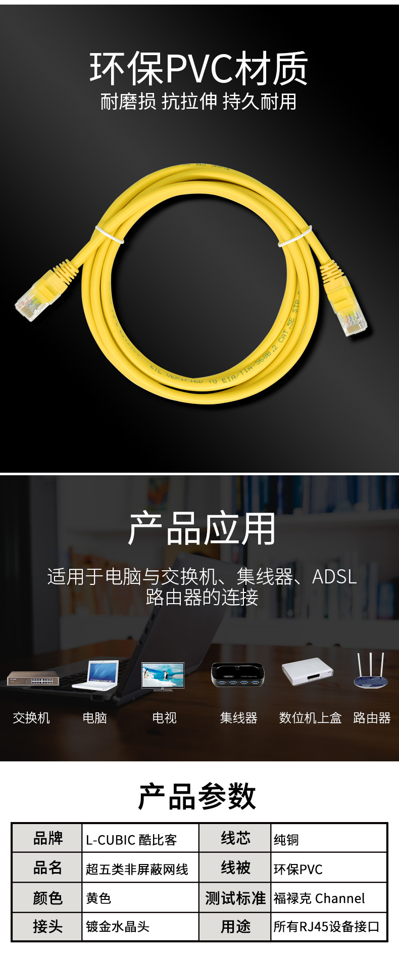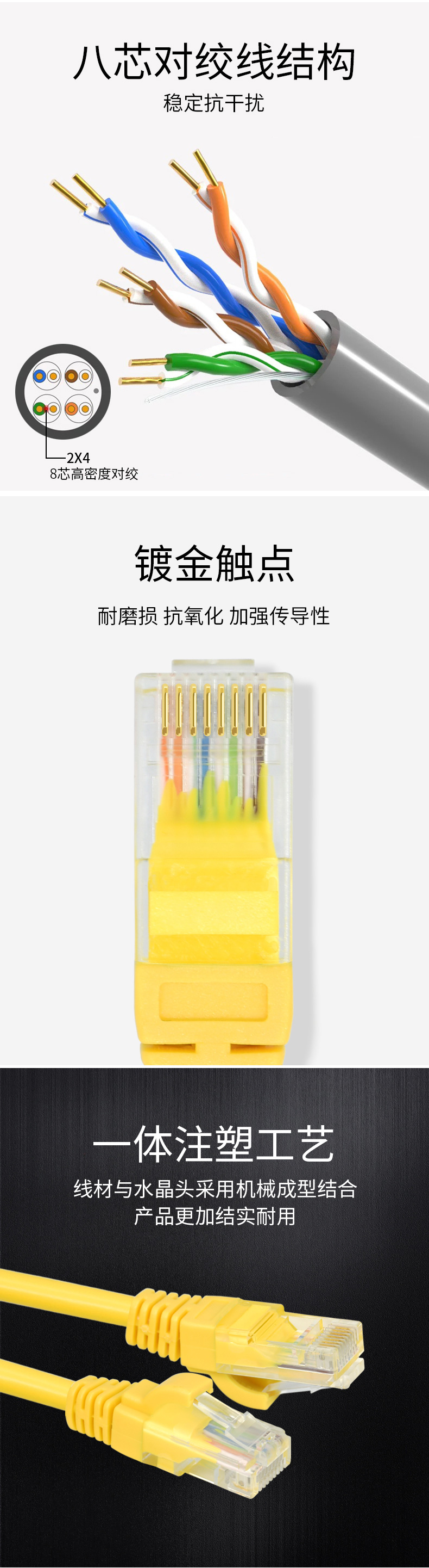 | 其他特性 | 1.超五类百兆网线,传输速率上限可达100Mbps 2.水晶头采用镀金插头,提供卓越的导通性,更有防锈蚀特性 3.线材与水晶头采用机器成型结合,产品更加结实耐用。 |