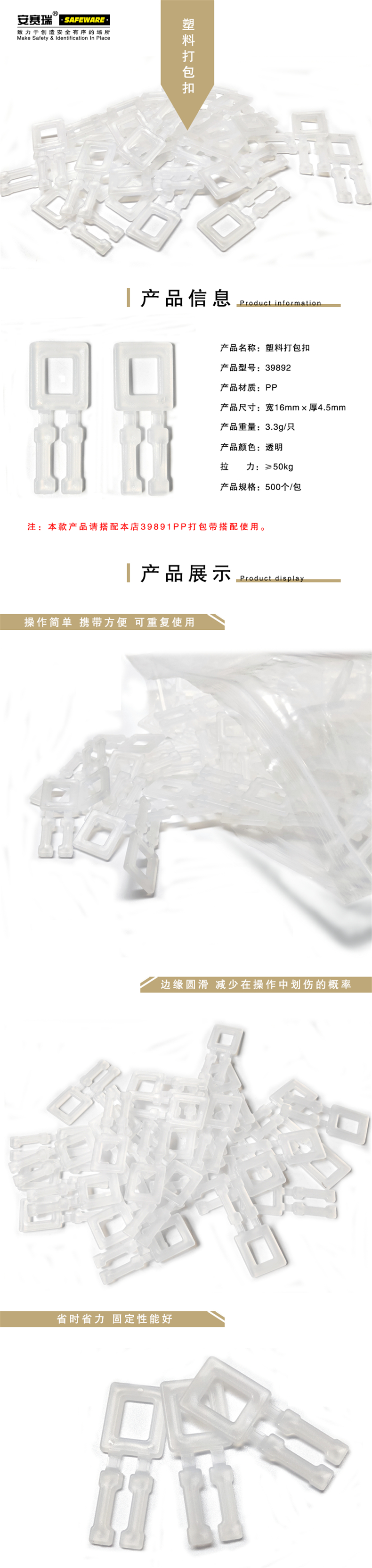 • 安赛瑞 39892 透明PP塑料打包扣(500个装)透明按(包)销售