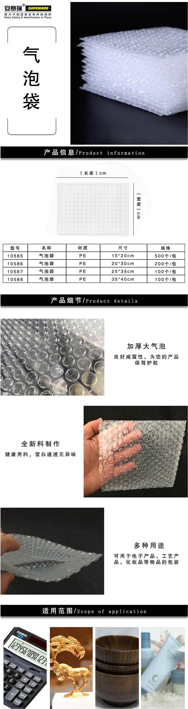 • 安赛瑞 10585 防震气泡膜包装袋(500片装) 15×20cm按(包)销售