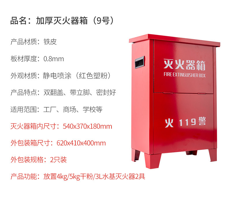 供应商:史泰博 品牌:轰烈消防 产地:中国 重量:5.000KG 销售单位:个 包装清单:9号灭火器箱(铁皮0.8mm)*1