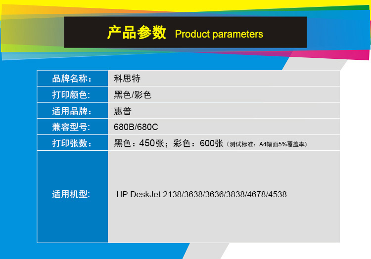| 适用机型 | 适用惠普DeskJet2138/3638/3636/3838/4678/4538 |