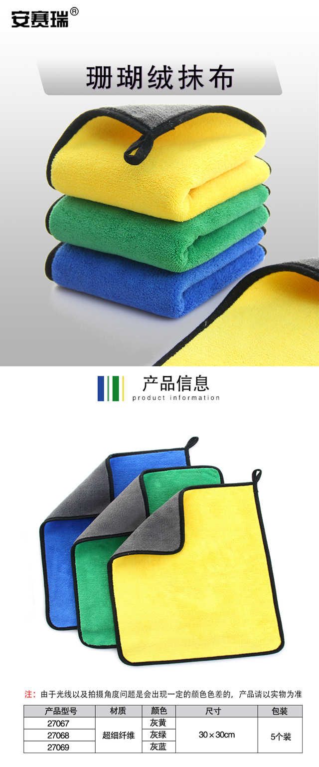 • 安赛瑞 27069 珊瑚绒抹布 超细纤维 5个装 30×30cm  灰蓝按(包)销售